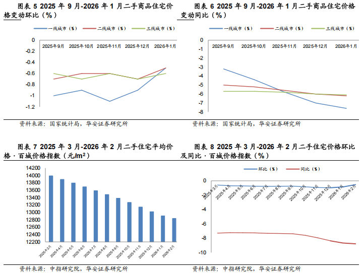 新房市场:价格环比降幅总体收窄,结构性企稳信号显现。根据国家统计局2026年1月份70个大中城市商品住宅销售价格变动数据,新房市场呈现“环比降幅收窄、同比仍处下行”的特征。具体来看,2026年1月,一线、二线、三线城市新建商品住宅销售价格环比分别为-0.3%/-0.3%/-0.4%。一线城市降幅与上月持平,其中上海价格环比持平,北京、广州、深圳分别下降0.3%、0.6%和0.4%。二线个百分点;三线城市降幅与上月相同。从同比看,一线%,降幅有所扩大,但上海同比上涨4.2%,表现显著优于其他一线城市。中指研究院数据显示,2月受春节假期影响,百城新建住宅平均价格环比微跌0.04%,但同比仍上涨2.37%。市场呈现分化,核心城市如上海、杭州、合肥等价格环比止跌或上涨,成为区域新房市场复苏的重要支点。