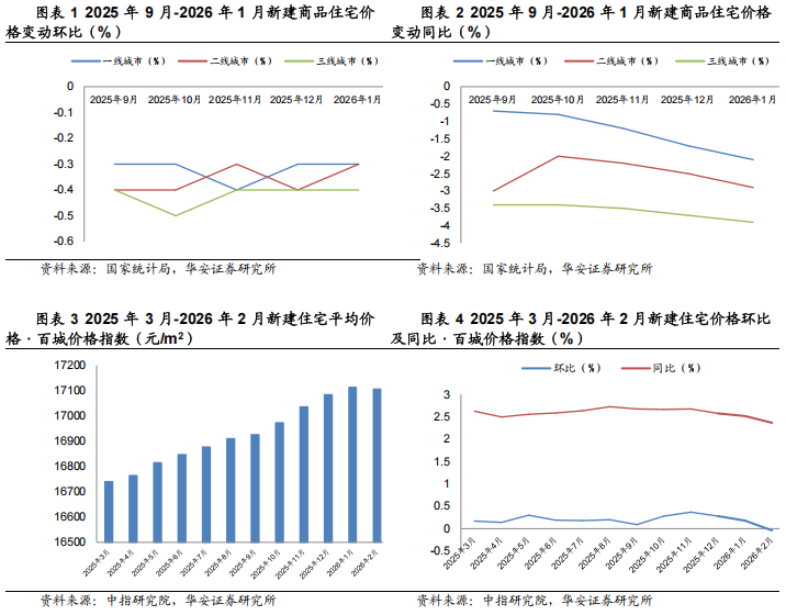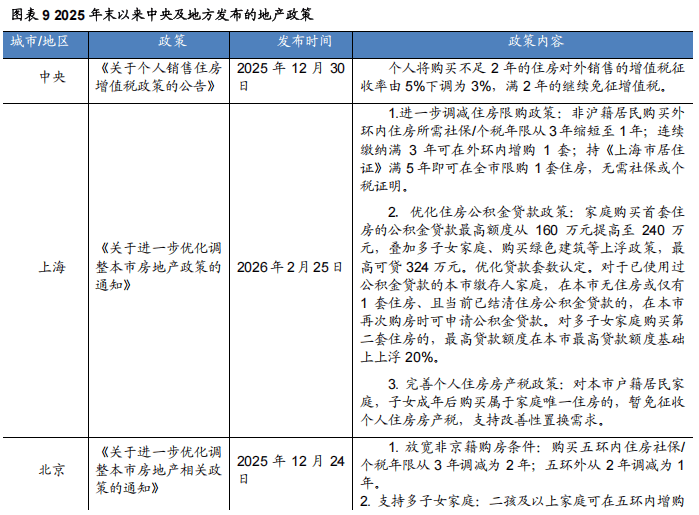 2026年政府工作报告对房地产的定调:着力稳定,构建新模式。2026年政府工作报告对房地产工作的部署核心目标是“着力稳定房地产市场”,政策导向从2025年的“止跌回稳”进一步转向“稳定提质”。报告明确了三大施策方向:1)供给侧管理:因城施策控增量、去库存、优供给,探索多渠道盘活存量商品房,鼓励收购存量商品房重点用于保障性住房等。2)需求侧支持与品质提升:深化住房公积金制度改革,以降低购房成本;优化保障性住房供给,加快危旧房改造,让人们买得起、住得起,更住得舒心;并有序推动安全舒适绿色智慧的“好房子”建设,实施房屋品质提升工程和物业服务质量提升行动,将“好房子”从概念推向具体实施。3)风险防控与制度建设:要求进一步发挥“保交房”的白名单制度作用,防范债务违约风险,并将“保交房”从阶段性任务升级为常态化机制;同时深入推进房地产发展新模式的基础制度和配套政策建设,着眼于长效机制。2025年末以来,中央及地方层面陆续推出多条稳定房地产市场的政策,巩固2026房地产市场稳中向好的发展态势。从中央层面,2025年12月30日,财政部、国家税务总局发布《关于个人销售住房增值税政策的公告》,个人将购买不足2年的住房对外销售的增值税征收率由5%下调为3%,满2年的继续免征增值税。从地方层面,上海作为一线日印发《关于进一步优化调整本市房地产政策的通知》(以下简称《通知》)。《通知》主要内容包括:1)进一步调减住房限购政策:非沪籍居民购买外环内住房所需社保/个税年限从3年缩短至1年;连续缴纳满3年可在外环内增购1套;持《上海市居住证》满5年即可在全市限购1套住房,无需社保或个税证明。2)优化住房公积金贷款政策:适度提高了住房公积金最高贷款额度;优化了贷款套数认定;扩大了多子女家庭购房支持范围。3)完善个人住房房产税政策:对本市户籍居民家庭,子女成年后购买属于家庭唯一住房的,暂免征收个人住房房产税,支持改善性置换需求。除上海外,北京、深圳等地方均推出稳定房地产政策,市场对房价趋稳的预期进一步增强,政策效应逐步显现,为后续全国其他城市市场企稳提供了有力支撑。