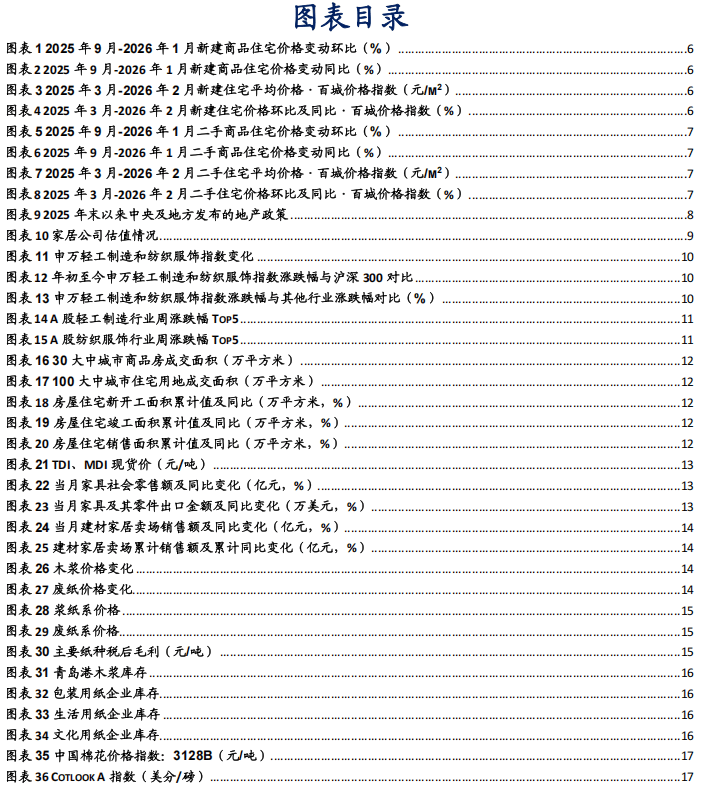 家居数据跟踪:1)地产数据:2026年3月1日至3月8日,全国30大中城市商品房成交面积112.99万平方米,环比-6.91%;100大中城市住宅成交土地面积112.31万平方米,环比+211.21%。2025年全年,住宅新开工面积4.3亿平方米,累计同比-19.8%;住宅竣工面积4.28亿平方米,累计同比-20.2%;商品房销售面积8.81亿平方米,累计同比-8.7%。2)原材料数据:截至2026年3月13日,软体家居上游TDI现货价为18300元/吨,周环比+11.93%;MDI现货价为17100元/吨,周环比+11.76%。3)销售数据:2025年12月,家具销售额为207.3亿元,同比-2.2%;2026年2月家具及其零件出口金额为525110.8269万美元;2026年1月,建材家居卖场销售额为1106.01亿元,同比+1.33%。包装造纸数据跟踪:1)纸浆&纸产品价格:截至2026年3月13日,针叶浆/阔叶浆/化机浆价格分别为5251.15/4548.16/3833.33元/吨,周环比-0.12%/-0.37%/-1.29%;废黄板纸/废书页纸/废纯报纸价格分别为1508/1780/2175元/吨,周环比-0.92%/-0.28%/-2.68%;白卡纸/白板纸/箱板纸/瓦楞纸价格分别为4244/3723.75/3596.2/2835.63元/吨,周环比-0.59%/0%/+0.51%/+1.86%;双铜纸/双胶纸价格分别为4690/4725元/吨,周环比0%/0%;生活用纸价格为5875元/吨,周环比0%。2)吨盈数据:截至2026年3月13日,双铜纸/双胶纸/箱板纸/白卡纸每吨毛利分别为-539.68/-562.15/494.91/-331.77元/吨。3)纸类库存:截至2026年2月28日,青岛港月度库存为1523千吨,月环比+11.17%;白卡纸/双胶纸/铜版纸月度企业库存天数分别为17.88/19.44/23.39天,月环比22.13%/10.27%/6.32%;白板纸/瓦楞纸/箱板纸月度企业库存分别为796/581/989千吨,月环比-9.24%/-8.72%/-12.35%;生活用纸月度企业库存为557.4千吨,月环比+7.5%。纺织服饰数据跟踪:1)原材料:截至2026年3月13日,中国棉花价格指数:3128B为16877元/吨,周环比+1.19%。截至2026年3月12日,CotlookA指数为75.7美分/磅,周环比+1.27%。截至2026年3月6日,中国粘胶短纤市场价为12800元/吨,周环比0%;中国涤纶短纤市场价为7210元/吨,周环比+7.61%。截至2026年3月10日,中国长绒棉价格指数:137为26470元/吨,周环比+0.11%;中国长绒棉价格指数:237为25710元/吨,周环比+0.12%。2)销售数据:2025年12月,当月服装鞋帽、针、纺织品类零售额为1661亿元,同比+0.6%;2026年2月,服装及衣着附件出口金额为1106147万美元。