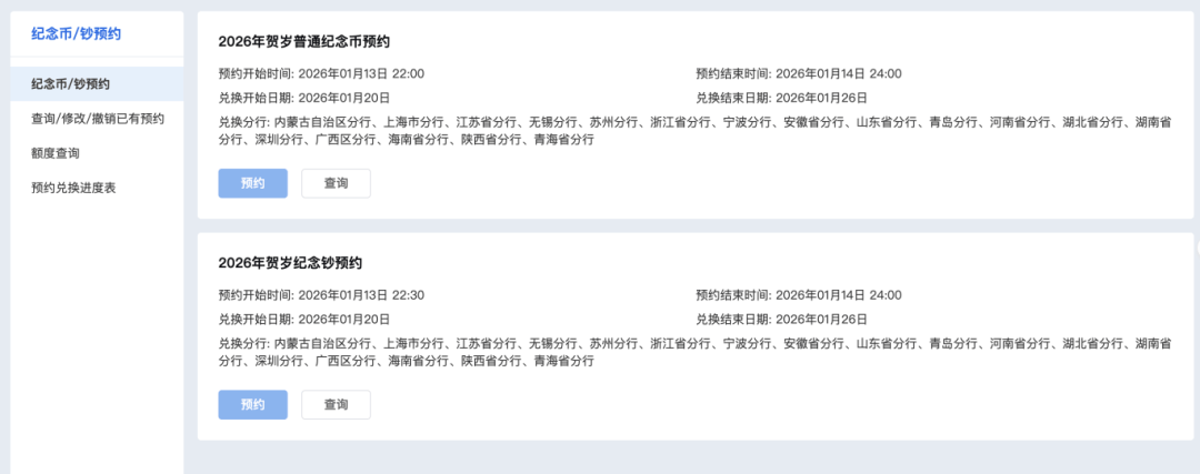 1月13日22:30至1月14日24:00。✅预约核实期为2026年1月17日至1月19日。✅兑换期为2026年1月20日至1月26日。预约兑换方式您在预约期内可通过交通银行指定预约渠道办理2026年贺岁币、2026年贺岁钞预约,预约并核实成功后在兑换期内或约定的日期到预约指定网点办理兑换,超出兑换期不予兑换。如您在兑换期内的非约定日期兑换,网点可能存在不对外营业的情况,兑换网点营业时间请详询95559。2026年贺岁币每人预约、
