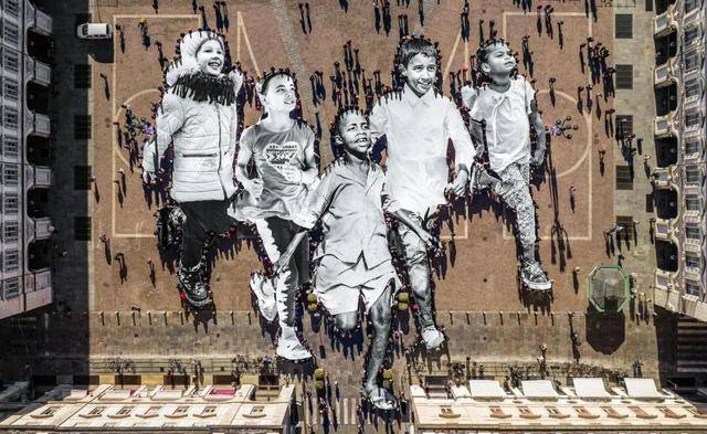 以JR 2023年在意大利都灵的Déplacé·e·s为例。项目中拍摄于乌克兰、卢旺达、毛里塔尼亚、哥伦比亚和希腊的五幅孩童肖像被数千人举起,从高空俯瞰的视角看去,他们仿佛齐聚广场,向同一个方向奔跑,玩耍嬉戏。这张图像之所以存在,“是要告诉大家那一天发生了什么”,JR说,“城市突然封锁,人们决定让这些孩子聚集在主广场上,成千上万的人从各地赶来。正是那个时刻——我们所有人一起努力促成这件事,同时知道它可能会失败——让图像变得特别,让它值得被记住。”