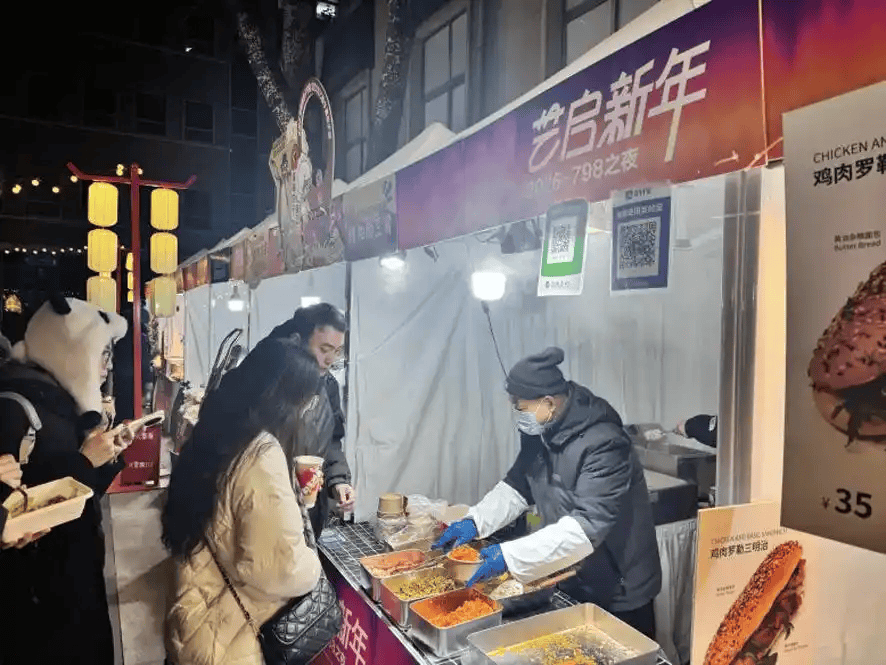 各个商圈的特色市集与餐饮外摆共同营造出了跨年夜的烟火气。在798园区内的新年市集上,小吃、手串、字画等摊位一字排开,每个摊位前都围满了人。市集深处的热饮摊位暖意融融,新疆咸奶茶、梨汤等饮品冒着热气,吸引着消费者购买,老板一边打包一边介绍道:“晚上天凉,热饮既能暖手又能解渴,特别受欢迎,一晚能卖几百杯。”除了市集,沿路餐厅的外摆区域也人头攒动,热红酒、烤肠等特色餐食一应俱全。“本来担心餐厅排队久,看到外摆有位置就直接点了份小吃配热饮,吃的同时还能感受园区的热闹氛围。”正在用餐的市民陈先生说。在不远处的蓝色港湾,“芝士大会”奶香四溢,各个主题摊位前围满了食客,多样的芝士吃法在这里“解锁”。
